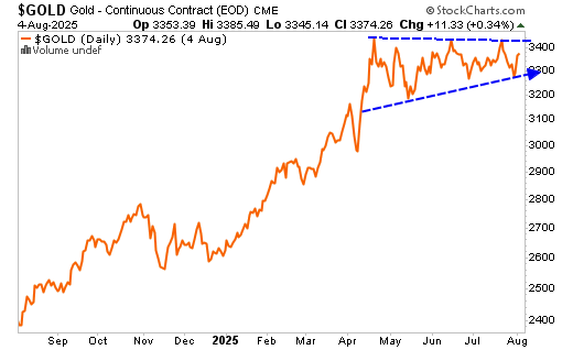 After a powerful surge from under $2,500 to over $3,300 in the past year, the yellow metal has formed a textbook ascending triangle.