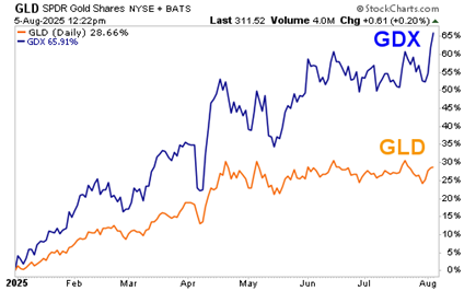 The GDX has already doubled the performance of gold and the GLD so far this year.