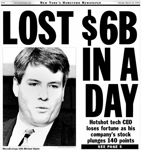 The stock slid all the way down to $0.45 per share, a 99.9% decline from its peak. A collapse that landed Saylor on the cover of the New York Daily News with the unenviable title of the man who “Lost $6 Billion In A Day.”